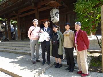 2018年3月25日 初宮参り 孫の初宮参りに、品川区の鹿島神社へ詣でました。お天気に恵まれ暖かく、お祓いを受けたあと皆で記念写真を撮りました。佑李君は安心して部屋の外に連れ出せるようになり、すくすくと育っている喜びに満ちあふれていました。 成長がますます楽しみです。 |