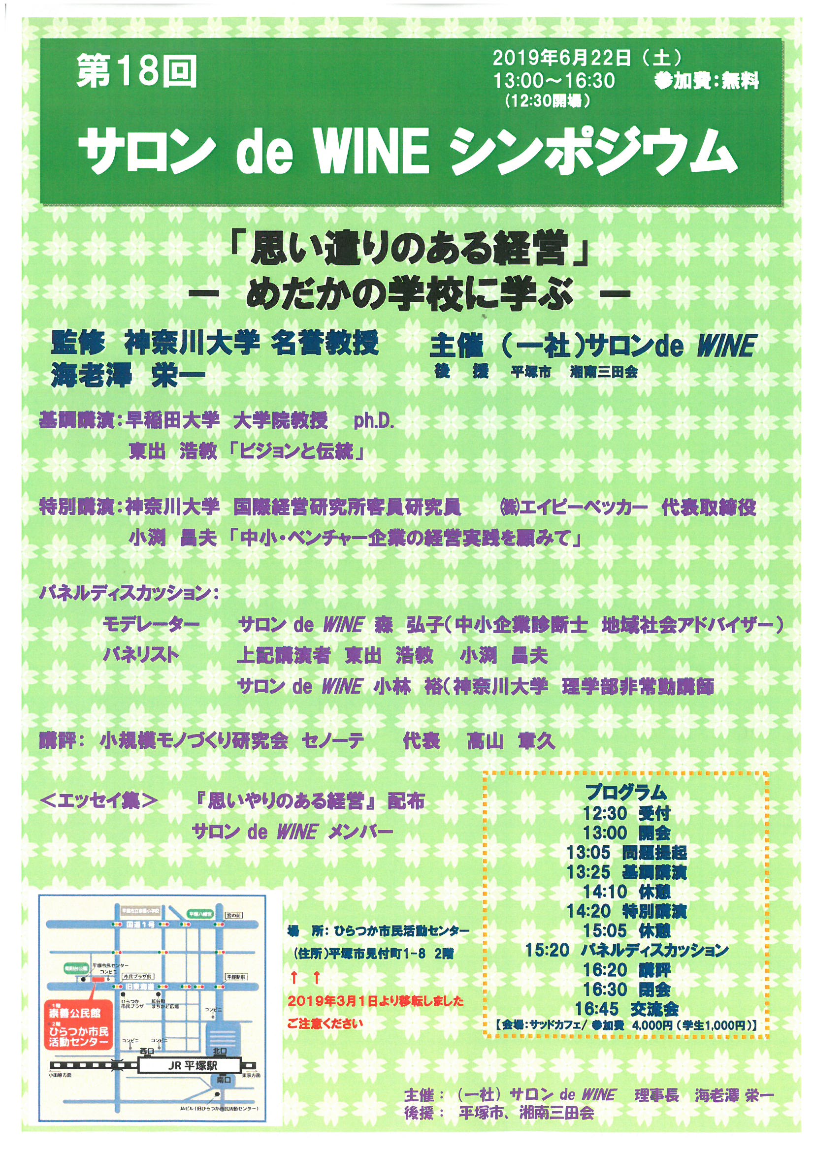 2019年6月22日 WINE研シンポジウム 毎年恒例のWINE研シンポジウムが今年も平塚市民活動センターで開催されました。今年の統一テーマは「思い遣りのある経営」でした。私はパネルディスカッションのパネラーとして参加しました。 いつものように海老澤栄一先生の問題提起から始まりました。ユーモアを交えながらシンポジウムのテーマに迫りました。次に、早稲田大学の東出教授が登壇され、基調講演「ビジョンと伝統」について講演がありました。特別講演として旧知の小渕さんが登壇され、「中小・ベンチャー企業の経営実践を顧みて」を講演されました。そして登壇者と私の3人によるパネルディスカッションのセッションの時間がやってきました。「思い遣り」をさまざまな視点から論じ、意見交換しながら1時間を過ごしました。 シンポジウム終了後、場所を移して懇親会がありました。ここでは毎回恒例になっているザ・パラドックスの演奏をしました。ハーモニカとギターとバイオリンの3人グループです。今年は四季のメドレーなど4曲演奏しました。参加者の皆さんに楽しんでいただけました。東出教授もギターの弾き語りを披露してくれました。 今年も新しい気付きをたくさん得ることができました。重いテーマでしたが、充実して有意義な1日を過ごしました。 |
