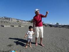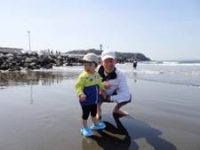 江ノ島海岸にて 彼岸の3連休に孫と娘が里帰りしました。娘が美容院に行くあいだ、私たち夫婦は孫と江ノ島海岸へ行きました。絶好の日和で海も穏やか。孫は初めての水遊びを楽しみました。 引潮の砂浜を歩いて波打ち際まで行きました。波が足にかかると、初めての経験にややびっくり。しかし、すぐに慣れていくのが分かりました。暖かい陽気に誘われて砂遊びを始めました。バケツに砂を詰めてはじょうろで水を撒くといった具合で、誰に教わったわけでもないのに自分で遊び方を工夫したようです。 おにぎりと大好きなチキンナゲットでお昼ごはんにしました。満足げな孫を見ながら楽しい時間を過ごしました。お腹一杯食べたあと、防波堤を歩いて江ノ島に近づいたところで記念写真を撮りました。少し風が吹いてきて、それもまた心地よく感じました。 世の中のコロナ騒ぎを忘れてのんびり過ごすことができました。 |