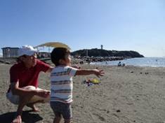2020年9月28日 孫と一緒に再び江ノ島海岸へ 娘の里帰りで、またまた孫が我が家にやってきました。娘の在宅勤務の邪魔にならないようにと、私たち夫婦と孫の3人で江ノ島海岸に遊びに行きました。江ノ電に乗りたいという孫のリクエストにも答えました。 長谷駅から江ノ電に乗って鎌倉高校前駅に向かいました。運転席のすぐ後ろに座れたのはラッキーでした。電車が動き出すと孫は食い入るように前を見ていました。稲村ケ崎を出ると車窓に海が広がり、江ノ島に向かって進みました。鎌倉高校前で降り、駅のベンチに座って湘南の海を眺めながら、長谷に戻る電車を待ちました。 江ノ電を降りたあと、車で江ノ島海岸に向かいました。この日は晴天に恵まれ、テントを張って海を眺めながらお弁当を食べることができました。お気に入りのチキンナゲットとおにぎりです。食事のあと、用意していた凧あげを楽しみました。孫は初めての体験でしたが、一緒に糸を引いて大空に上がる凧を眺めました。 海と空に囲まれて、孫と一緒にのんびり過ごすことができてよかったです。 |