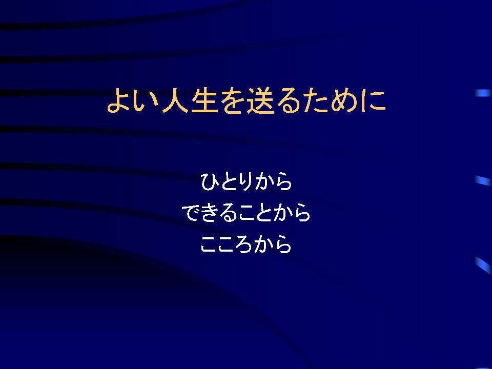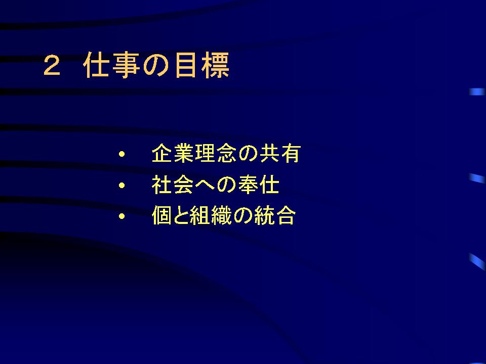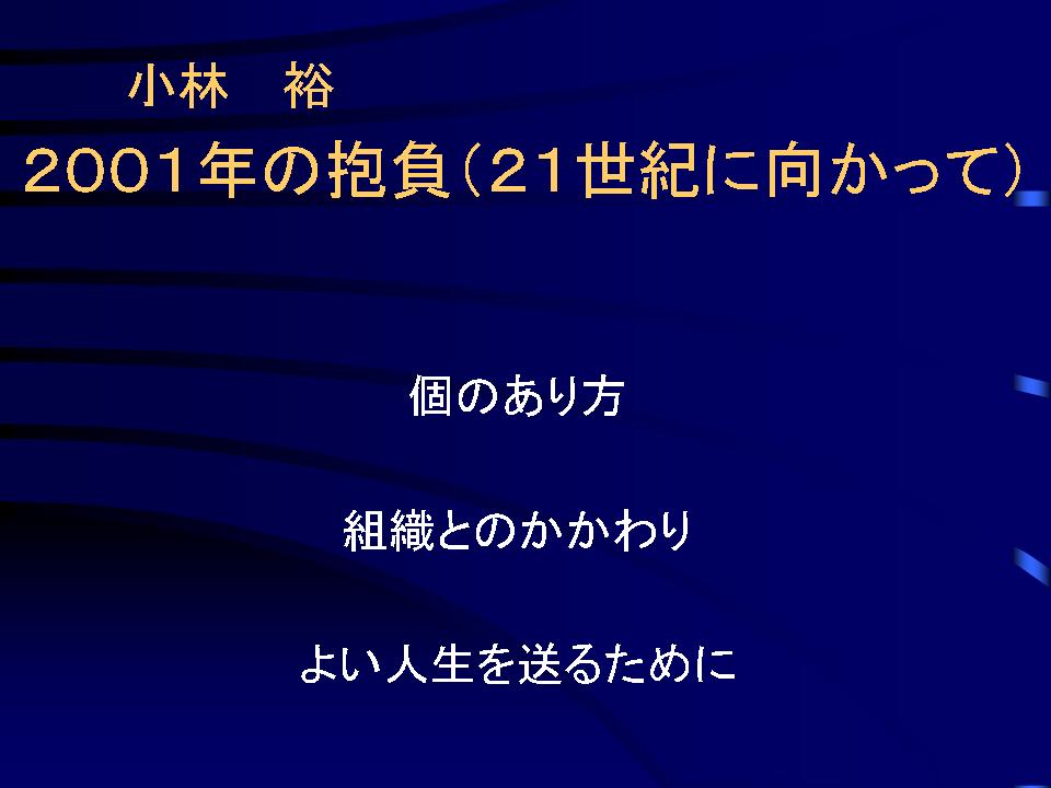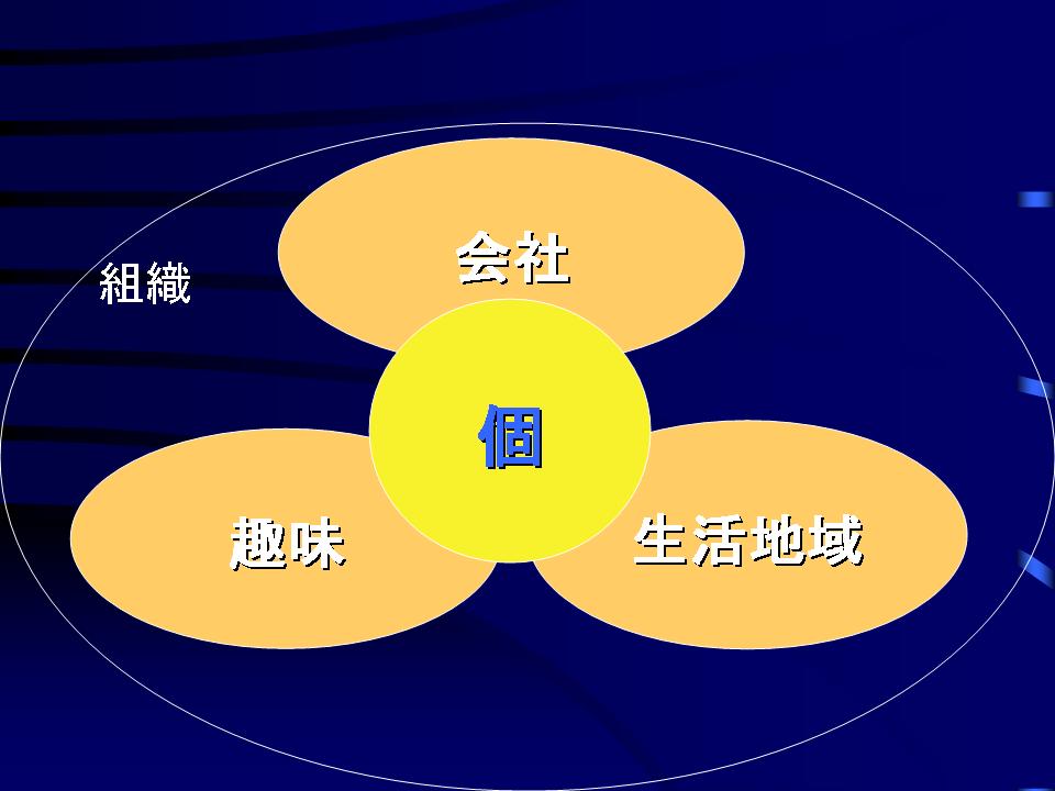 | 個と組織の統合を目指します。部分のつなぎ合わ せのような人生を反省し、自分と自分を取り巻く全 てを出来るだけ有機的につなぎ合わせることをこれ からの目標とします。 時間を使うと言うことは、それだけ心を使うと言う こと。心の時代にふさわしい心豊かな生活を送りま す。 |