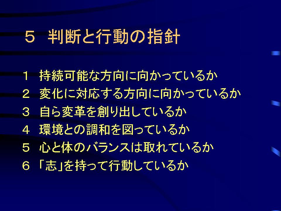 判断と行動の指針は、以下の6項目に集約するこ とが出来ます。 自分を支えてくれる人々や環境を大切にして、いつ までも平和であることを尊びます。そのためには自分 自身も柔軟でなければなりません。関係性を重視し た健全な行動原理に基づいて物事を進めます。 いつでも心の中に志を持つことを心掛けます。 |